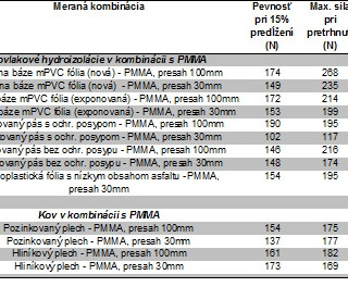 použitie PMMA na asfaltovanom páse bez ochranného posypu zvyšuje pevnosť vzájomného spoja a zníženie minimálnej dĺžky spoja zo 100 mm na 30 mm spôsobilo zníženie šmykovej odolnosti spoja o 19,44%;