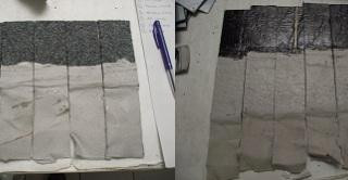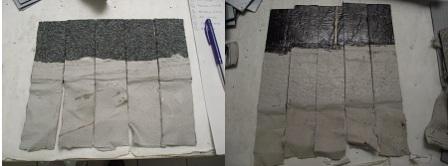 Za účelom získania a overenia vlastností boli vytvorené jednotlivé merané kombinácie povlakových krytín a kovových materiálov s hydroizolačnou hmotou na báze PMMA. Okrem rôzneho typu materiálu, na ktorý bola aplikovaná hmota PMMA, boli tiež odskúšané rozdielne dĺžky vzájomného spojenia materiálov. Dĺžka vzájomného spojenia materiálov bola 30 mm a 100 mm. Šírka meraných telies, pre stanovenie mechanicko-fyzikálnych vlastností, bola 50 mm. V každej kombinácii bolo meraných päť skúšobných vzoriek pre získanie relevantných výsledkov. Podstatou merania bolo overiť šmykovú odolnosť spojov pri vzájomnom spojení rozdielnych materiálov a to skúškou v ťahu a zistiť tiež ich pevnosť pri menšej dĺžke vzájomného spojenia ako je hodnota odporúčaná.